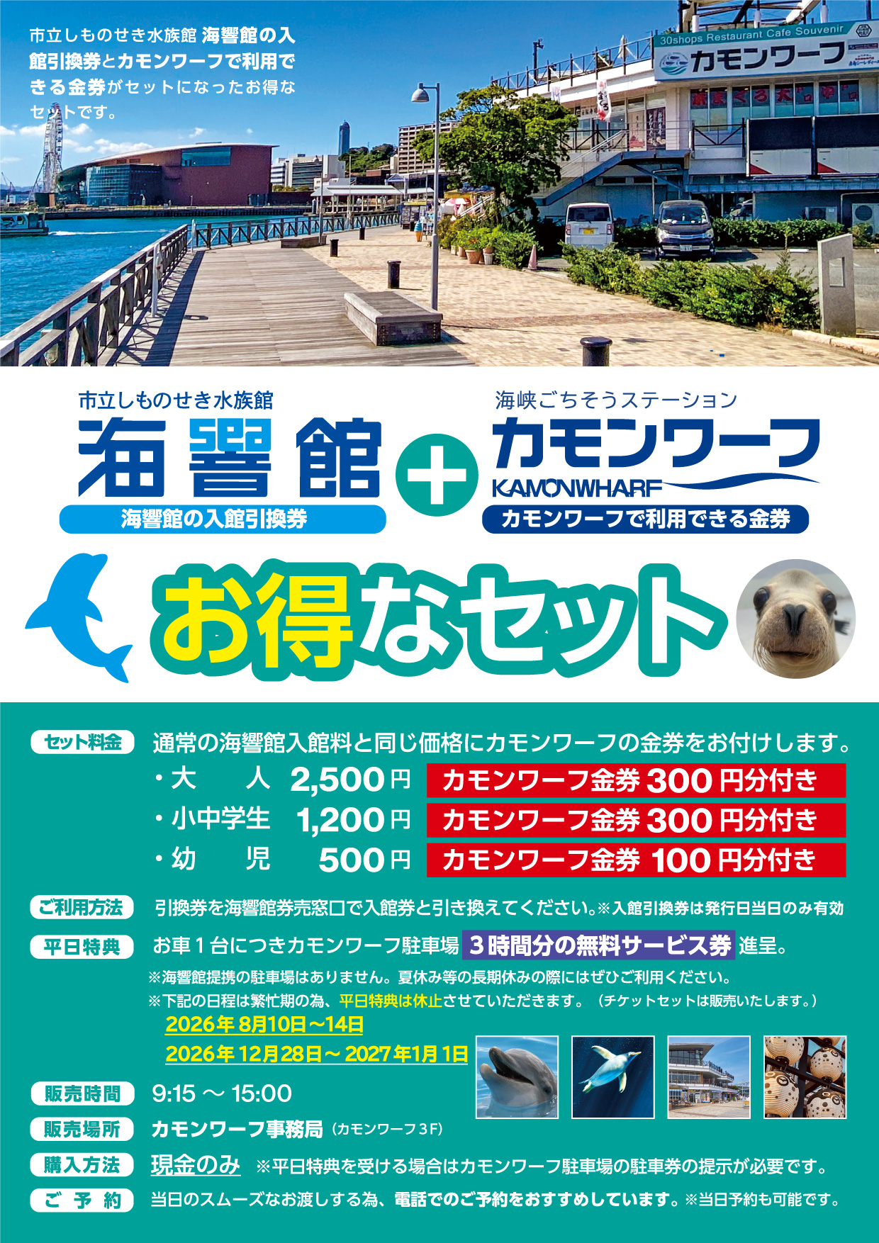 2025年8月1日に改修リニューアルオープンする海響館の入館引き換券とカモンワーフの金券がセットになったお得なプランができました。さらに平日(月~金)特典としてカモンワーフ駐車場のサービス券3時間分をお付けいたします。